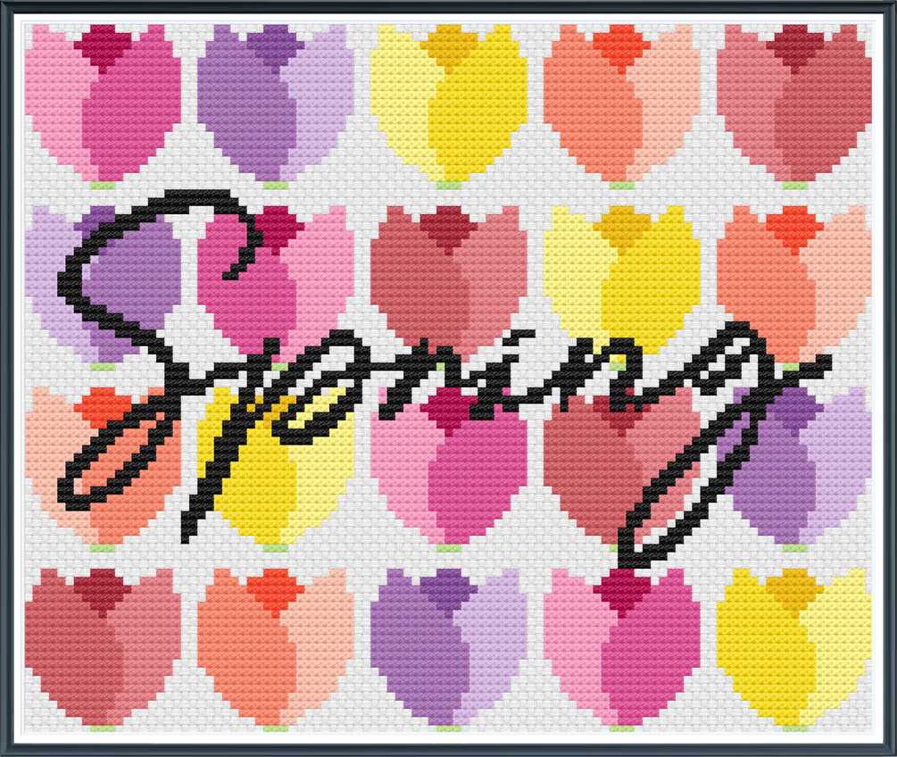 Floss is DMC 208, 209, 211, 307, 310, 347, 444, 445, 600, 603, 605, 608, 760, 967, 3341, 3348, and 3712